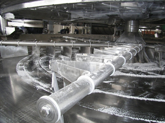 濕物料自加料器連續(xù)地加到干燥器上部第一層干燥盤上,帶有耙葉的耙臂做回轉(zhuǎn)運(yùn)動(dòng)使耙葉連續(xù)地翻抄物料。物料沿指數(shù)螺旋線流過(guò)干燥盤表面,在小干燥盤上的物料被移送到外緣,并在外緣落到下方的大干燥盤外緣,在大干燥盤上物料向里移動(dòng)并從中間落料口落入下一層小干燥盤中。大小干燥盤上下交替排列,物料得以連續(xù)地流過(guò)整個(gè)干燥器。中間的干燥盤內(nèi)通入加熱介質(zhì),加熱介質(zhì)形式有飽和蒸汽、熱水和導(dǎo)熱油,加熱介質(zhì)由干燥盤的一端進(jìn)入,從另一端導(dǎo)出。已干物料從最后一層干燥盤落到殼體的底層,最后被耙葉移送到出料口排出。濕份從物料中溢出,由設(shè)在頂蓋上的排濕口排出,真空型盤式干燥器的濕氣由設(shè)在頂蓋上的真空泵口抽出。從底層排出的干物料可直接包裝。通過(guò)配備翅片加熱器、溶劑回收冷凝器、布袋除塵器、干料返混機(jī)構(gòu)、引風(fēng)機(jī)等輔機(jī),可提高其干燥的生產(chǎn)能力,干燥膏糊狀和熱敏性物料,可方便地回收溶劑,并能進(jìn)行熱解和反應(yīng)操作。